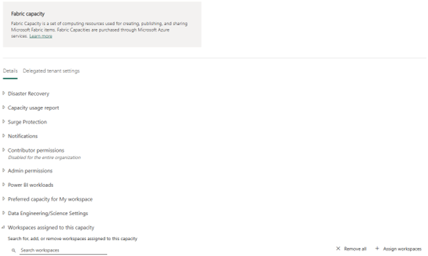 c. The entire organisations workspaces: You can also assign all workspaces and “My Workspaces” in an organisation to a specific capacity. Capacity settings, selecting the Workspaces assigned to this capacity link. And the clicking the + Assign workspaces button on the right side of the screen.